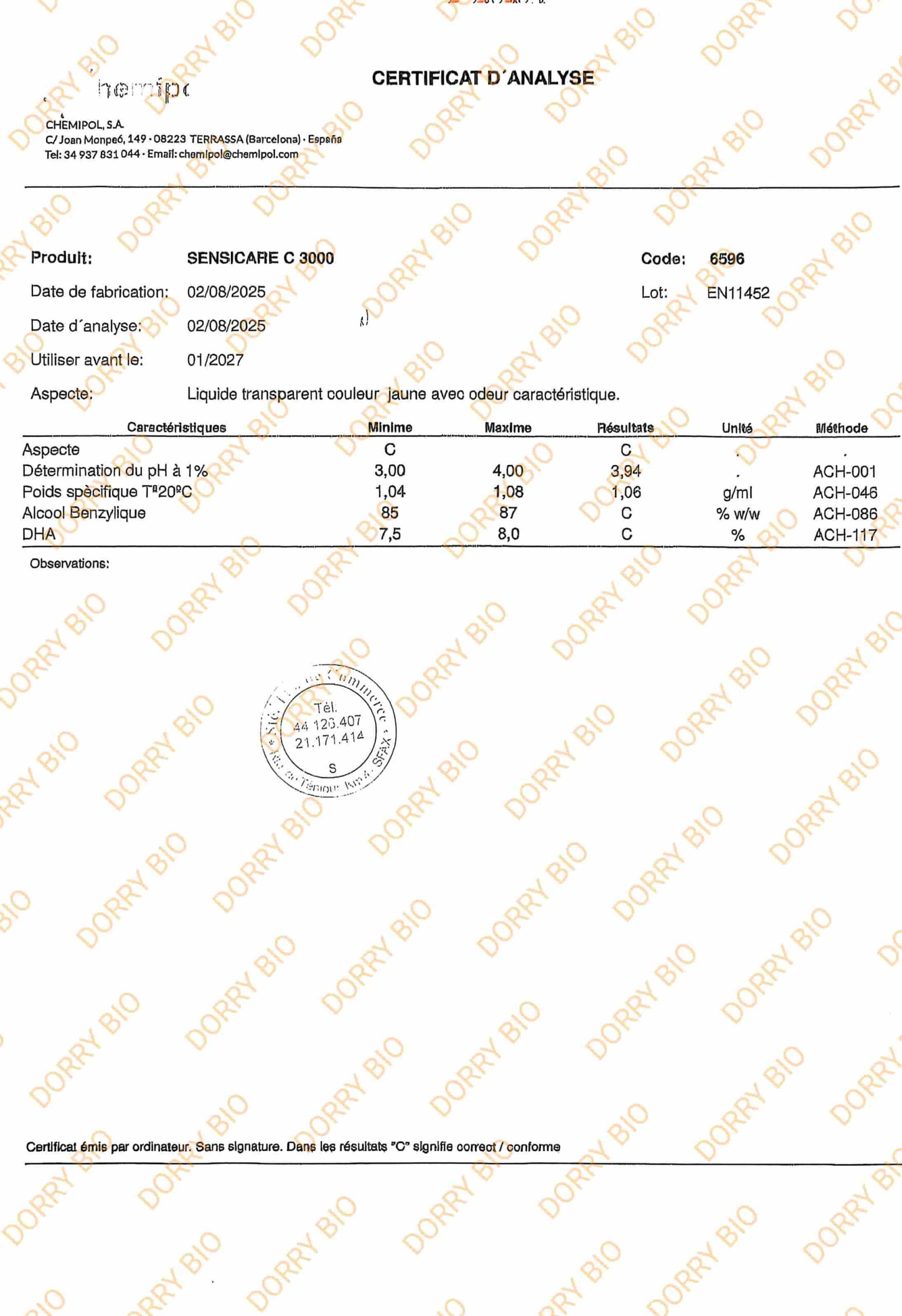 Allergènes : Contient de l’alcool benzylique, substance potentiellement sensibilisante. Un test de tolérance (pli du coude) est recommandé sur le produit fini.
